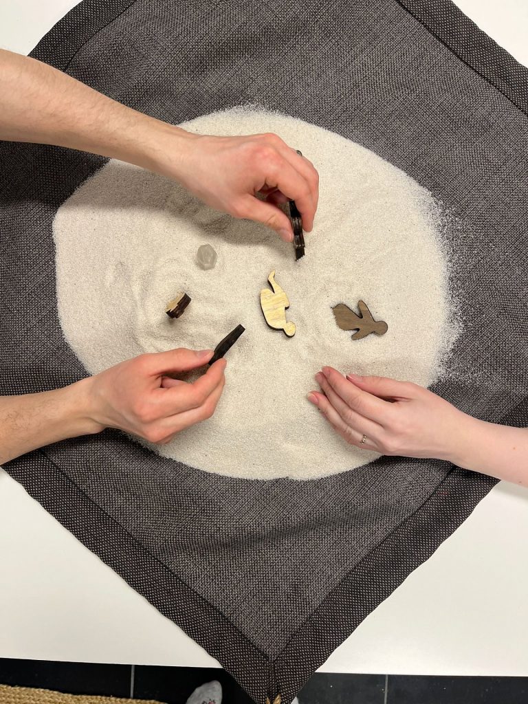 Hiekkaan luodaan kuvaelma käyttäen pieniä miniatyyri hahmoja. Samalla lailla kuin maalatusta kuvasta, niin tästä hiekkaan tehdystä teoksesta keskustellaan ja sitä käytetään sanallisen ilmaisun tukena. Menetelmä sopii kaikille ja voi olla helpompi asiakkaille, jotka kokevat, etteivät halua maalata tai piirtää, mutta voisivat silti hyötyä
